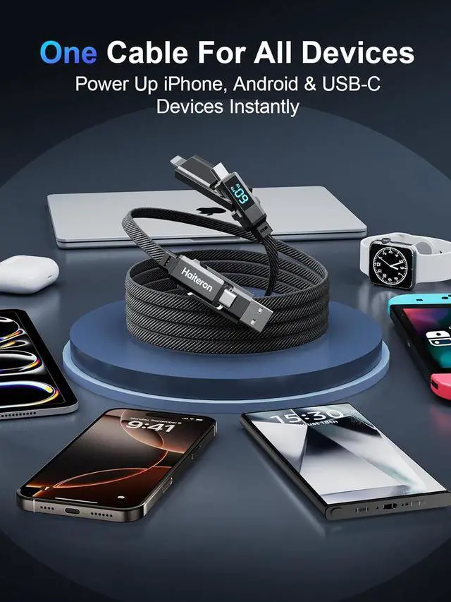 It maintains safe temperatures and prevents overheating or overchargingideal for overnight use. What's more the built-in smart chip displays real-time charging power letting you monitor your charging power and enjoy efficient power delivery. [So Strong Nylon Braided Cable] The usb c charger cable boasts an impressive 10 000+ bend lifespan! Made of upgraded anti-tangle nylon ensuring it withstands daily wear and tear. The sturdy zinc alloy housing is 1000 times stronger than plastic ensuring consistent and reliable charging every time. Built to last and withstand daily use. [Tangle-Free & Travel Essentials] Every Haiteron 4 in 1 cable comes with a velcro strap to keep cables well-organized untangled and easy to carrywhether you're headed to the office or on vacation.