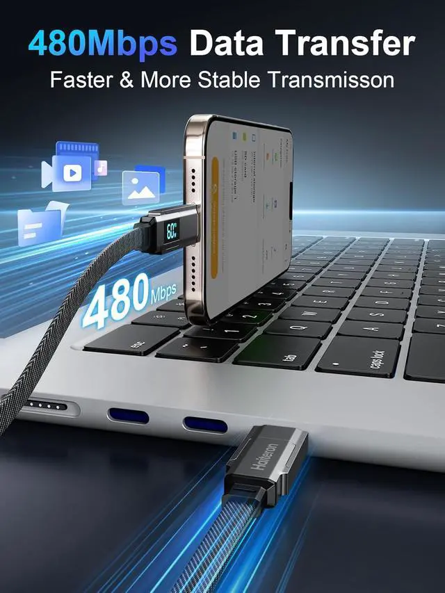 Just 35 minutes it can charge your iPhone 16 to 80% S23 to 83% MacBook Pro to 75% and iPad Pro to 85%. Please ensure you're using a compatible USB-C adapter with sufficient power for optimal results. With USB 2.0 data transfer speeds of up to 480Mbps you can move 1200+ songs or thousands of photos per minute. Whether its work files or music your data is in good hands. [PD 3.1 Emark Safe Chip & LED Display] The integrated E-Marker 3.1 chip ensures intelligent power delivery automatically stopping charging when your battery is full.
