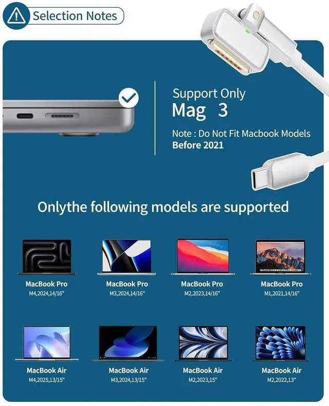 Perfect compatibility with multiple models: precisely compatible with MacBook Air (M2/M3/M4 2022-2025 13/15) MacBook Pro (M1/M2/M3/M4 2021-2024 14/16). Magnetic connector for instant connection no need to repeatedly plug and unplug dust-proof and corrosion-resistant making it the ideal companion for business travel and mobile office use.