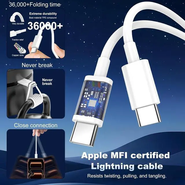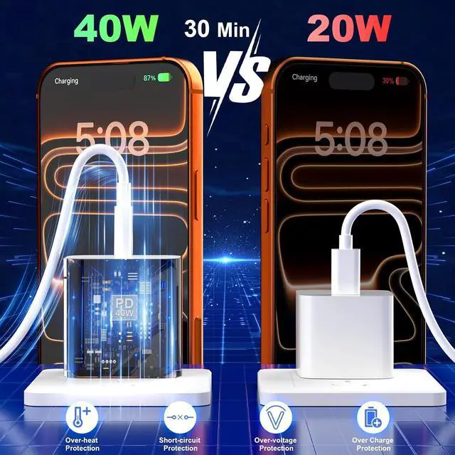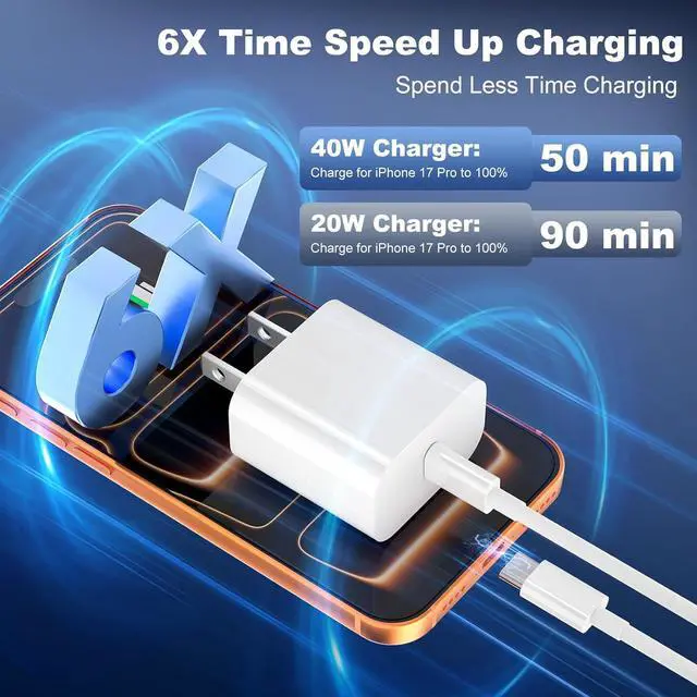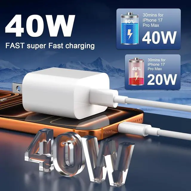 ?? 40W USB-C Fast Charger for iPhone 17 16 15 This 40W iPhone 17 Fast Charger USB C Block with 10ft USB-C to C Cable delivers max 60W output charging iPhone 17Pro Max to 80% in 30 minutes (6X faster than original 5W chargers). The USB-C ports intelligently distribute power ensuring both your phone and watch stay charged efficiently.?? USB C iPhone 17 Charger Cable Cord Included 6ft USB C to USB C Charger cable supports PD 3.0 fast charging up to 60W (15V/3A) and 480Mbps data transfer. The reversible design ensures easy connectivity while reinforced joints and tangle-free construction enhance durability for daily use.