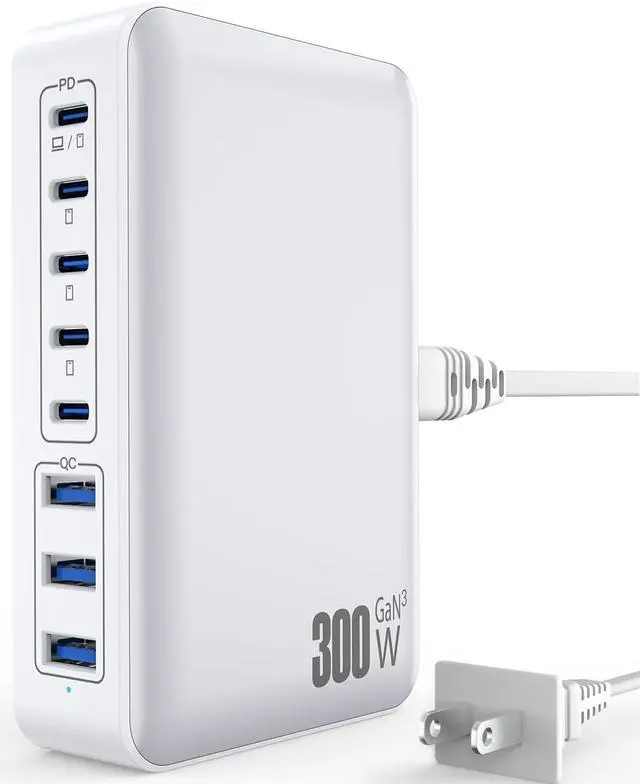 USB Charger Block: Enjoy the convenience of high-capacity and fast charging with this 300W desktop USB C charger block. Equipped with 5 USB-C and 3 USB-A ports it allows you to charge multiple devices at the same time. Simply use one usb power strip to provide best power supply for laptops tablets smartphones Bluetooth speakers and other small gadgets like earbuds smartwatches and game consoles it has universal compatibilit.