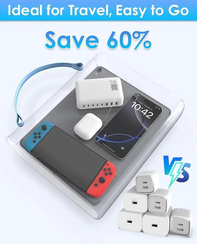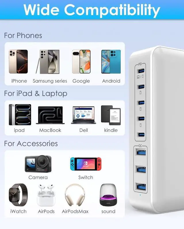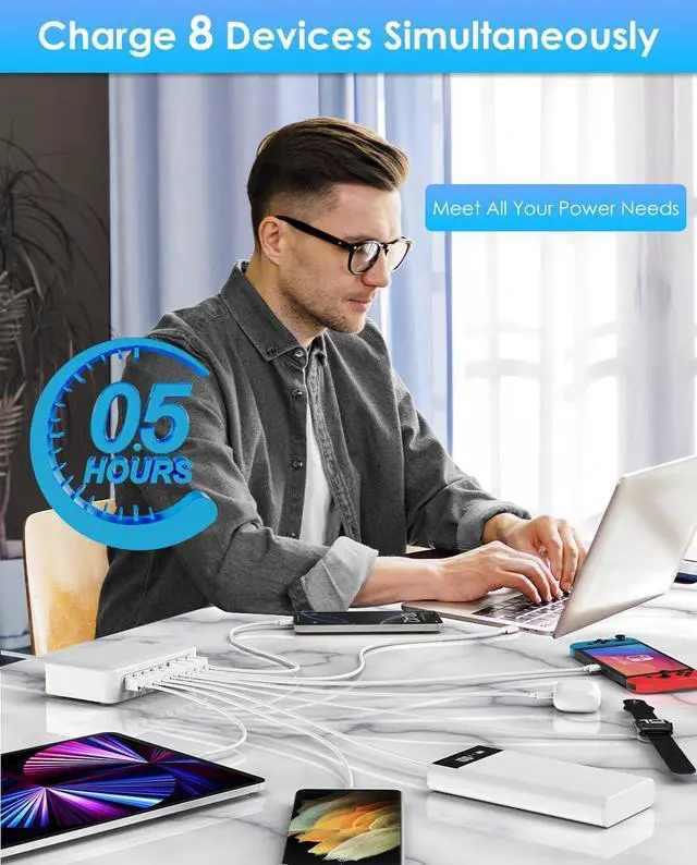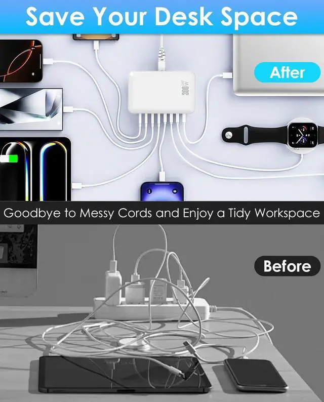 Total power: 300W) The USB C charger block offers exceptional performance for laptop charging port and supports the PPS PD. This usbc charger block is compatible with MacBook Pro 16 15 13 as well as MacBook Air 13 12 along with and HP laptops all at full peed fast charging. 8-in-1 Charging blocks to keep your desktop organized: The usb charging station can efficiently power multiple devices and reduce clutter at the same time making it perfect for limited space or sharing spaces whether you're in the library conference room cafe table. No more tangled cables or competing sockets ample multi ports make it an essential decluttering accessory for collaboration environments. Global Compatibility Worry-Free usb charging station: This charging station supports a wide voltage range of 100-240V means this usb power hub is perfect for international travel. Whether you're in North America Europe or Asia you can rely on this charger block. The 5ft extended cable enhances flexibility. You can easily position it in your workspace living room or nightstand without being limited by outlet placement. More Compact Safe and Reliable