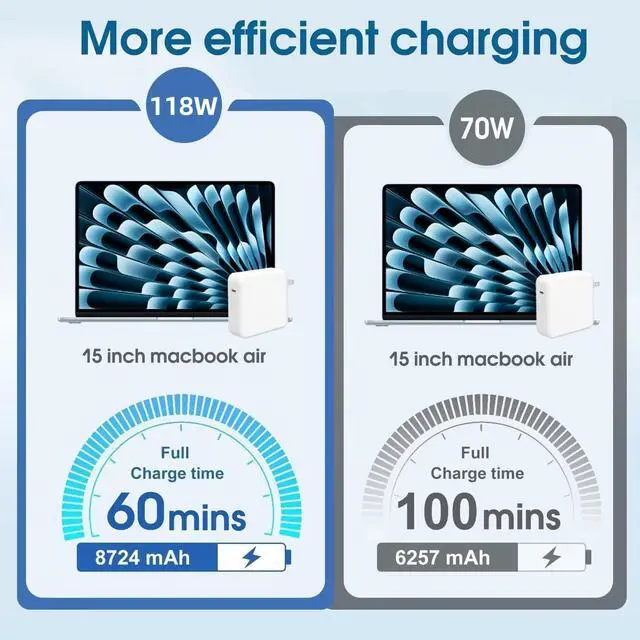 Smart Output: 20.5V / 5.9A 15V/3A 12V/3A 9V/3A 5.2V /3A automatically detects your devices needs delivering the safest and fastest current for all USB-C devices. 118W USB C power adapter support the high-speed processing capacity of M1 M2 M3 M4 M5 chip Alternative Mac book charger