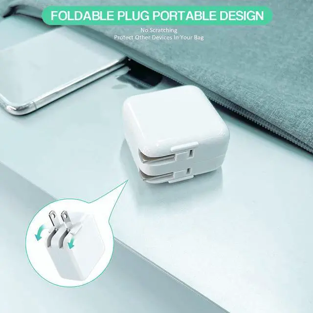?? iPad Charger Fast Charger Foldable PlugWith 100-240 volt input and replaceable iPad charger block this iPad Charger is ideal for worldwide travel. Designed for avoiding any possible scratch damage in your pocket the 90 degrees foldable block is perfect for use both at home and on the go. Besides quick-charge USB port provides Max 12W output power charge your devices up to 2.5 x faster than original 5W charger saving over 1 hour for you.?? 10 FT Long USB to Lightning CableYou could connect your MacBook/Pro with iPhone/iPad directly and enjoy the 480 Mbps data transfer speed.