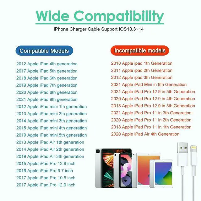 Tangle-free 10 Foot length is convenient for usage while charging and sync at home/office/travel in bed hotel rooms and more.?? Long iPad Charger Cable 12W USB Power Adapter with the smart Chip the USB to lightning cord equips automatic chip recognition function. The chip ensures 100% flawless compatibility with devices. No more trigger warning messages. Compatible for iPad 4/ 5/ 6/ 7/ 8/ 9th/ Mini/ Mini 2/ Mini 3/ Mini 4/ Mini 5/ Air/ Air 2/ Air 3/ iPad Pro 12.9 inch (2015) / iPad Pro 9.7 inch (2016) / iPad Pro 10.5 inch (2017) iPhone and more.