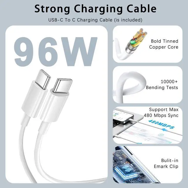 What's in package: 1 Pack 96 Watt Wall Charger; 1 x 6.6FT Type C to C Cable; 1 x Instruction for