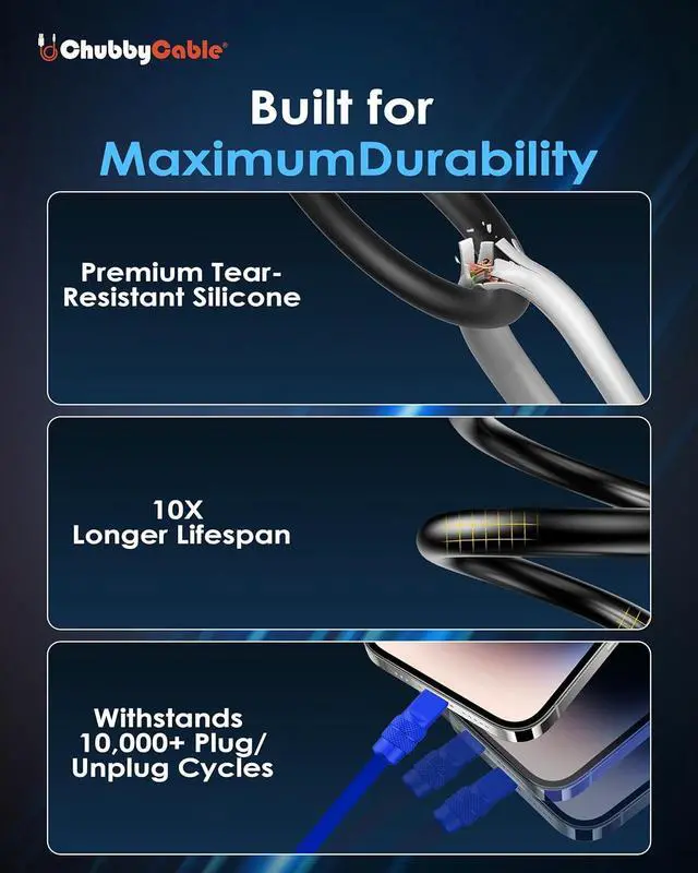 TO LAST: Engineered with high-quality silicone material and an anti-corrosion zinc-aluminum alloy shell our durable USB C cable resists dust wear and daily damage. The thick 6mm design offers extra toughness while the UV coating keeps your USB type c fast charger cable looking and performing like new. With a tested 40 000+ bend lifespan it outlasts most cables in its price range delivering reliable performance for years to comeE-MARK