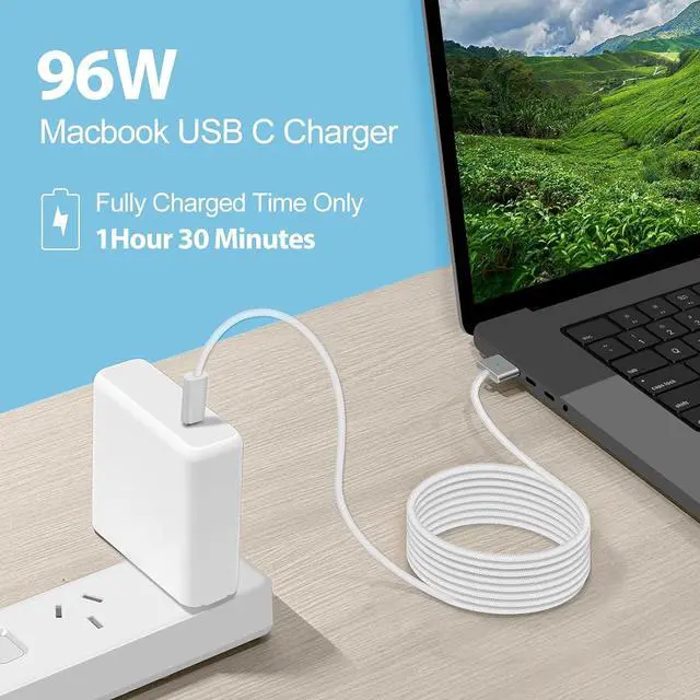 Output: 20.5V 4.7A (USB PD) 20V 4.7A /15V 3A/12V 3A/9V 3A//5V 3A. Charge your Mac Book Pro or Mac Book Air to 50% in just 30 minutes. Our advanced charger delivers superior stability and efficiency over standard 35W and 70W models effortlessly meeting the high-power demands of M-series Pro and Max chips. [Broad Mac Compatibility] Designed for the Mac ecosystem this charger is widely compatible with: Mac Book Pro 14