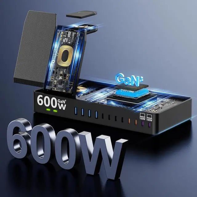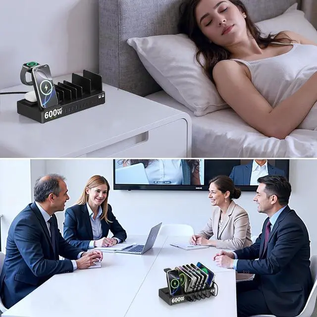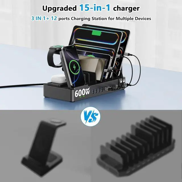 15-In-1 Charging Station for Multiple DevicesThis multi-device charging station lets you fulfill all your device charging needs with one device! Features 3 in 1 Wireless Charger 12 USB ports (8 USB-C+4 USB-A) sharing 600W of power can power up to 15 devices simultaneously this charging station is a perfect combination of Wireless Charger and Usb ChargerDual PD 100W Fast Laptop ChargerThis multiports USB C charging station equips 2*PD 100W fast charger ports 2*PD 65W and 4*PD 60W 4*QC 20W fast charger ports to charge multiple devices simultaneously. We're specially designed two extra-wider and taller slots in the side each measuring 1.57 wide and 1.77 high.
