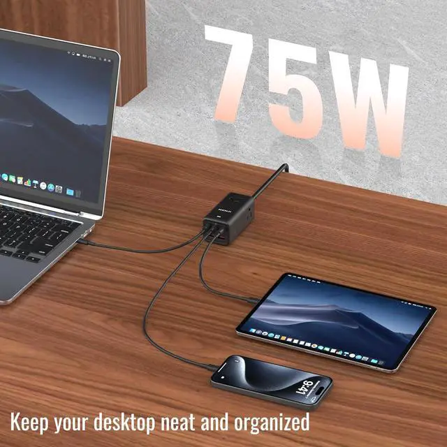 PORTS: Featuring 5 USB ports and 3 AC outlets (10A 125V 1250W) this USB C Power Strip efficiently charges multiple devices simultaneously75W
