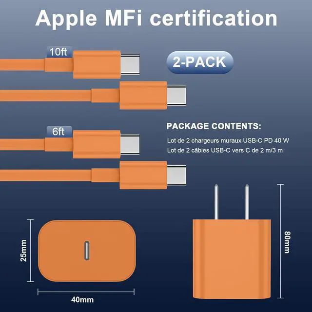 ?? Advanced Safety Protection for iPhone 17 Charger Block 40W USB C Charger Offers Multiple Safeguards Automatically. ETL FCC CE ROHS Certificated. Multi-Charging Protection Keeps Your Device Safe From Over-Current Over-Voltage Over-Heating & Short-Circuiting. The UL certified wall charger built-in over-voltage protection features a stable voltage. the USB C cable built-in smart chip to match the current required by devices automatically. dynamically adjusts power output (5V/3A 9V/3A 15V/3A 20V/ 2.25A ) to match device requirements ensuring rapid yet secure charging.?? What You Get Includes 2×40W Fast Charger USB C Block + 2×6ft USB-C to C Cable.