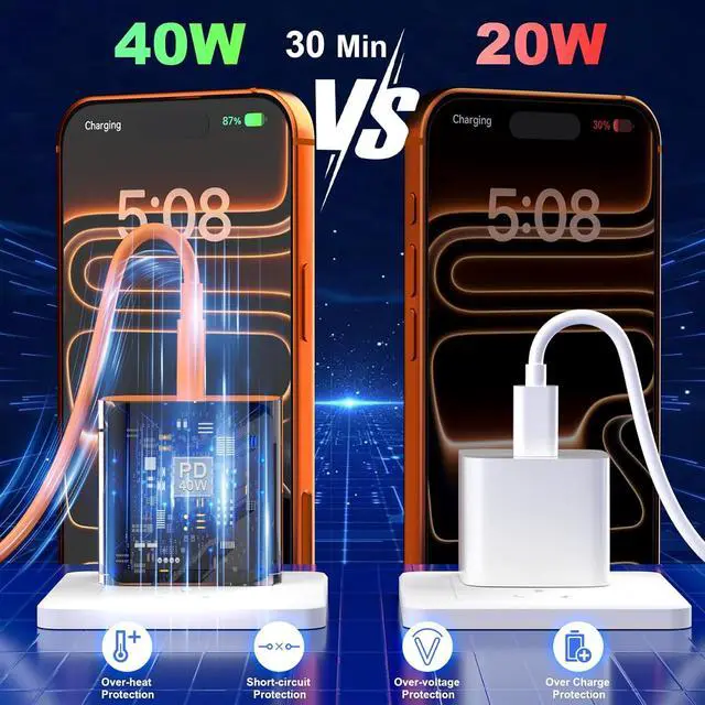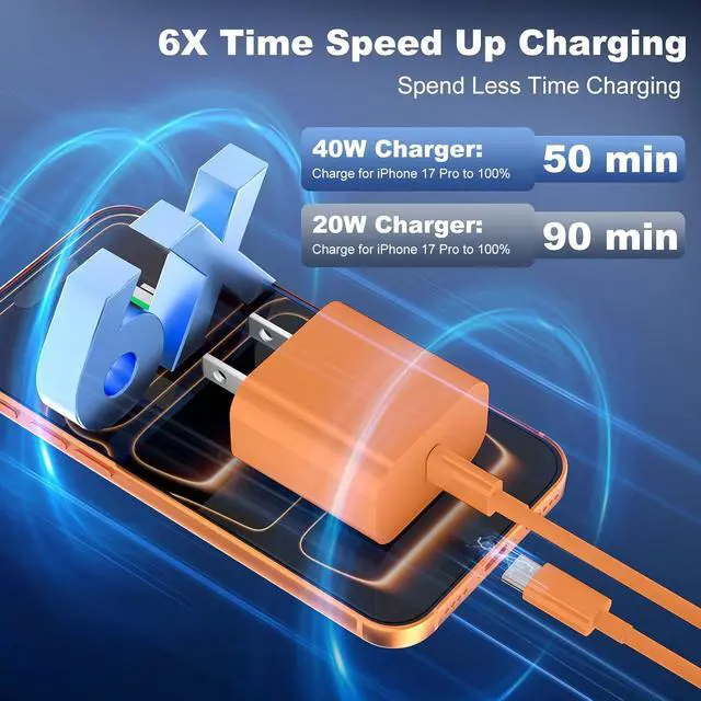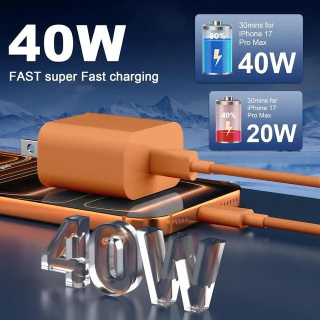 ?? 40W USB-C Fast Charger for iPhone 17 16 15 This 40W iPhone 17 Fast Charger USB C Block with 10ft USB-C to C Cable delivers max 60W output charging iPhone 17Pro Max to 80% in 30 minutes (6X faster than original 5W chargers). The USB-C ports intelligently distribute power ensuring both your phone and watch stay charged efficiently.?? USB C iPhone 17 Charger Cable Cord Included 6ft USB C to USB C Charger cable supports PD 3.0 fast charging up to 60W (15V/3A) and 480Mbps data transfer. The reversible design ensures easy connectivity while reinforced joints and tangle-free construction enhance durability for daily use.