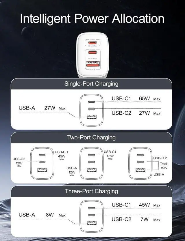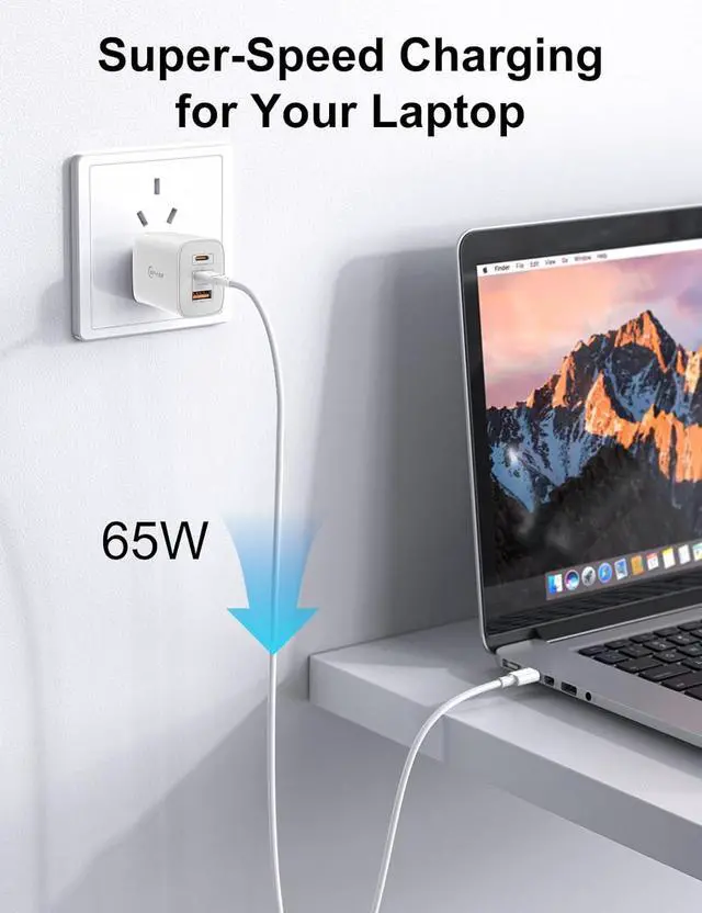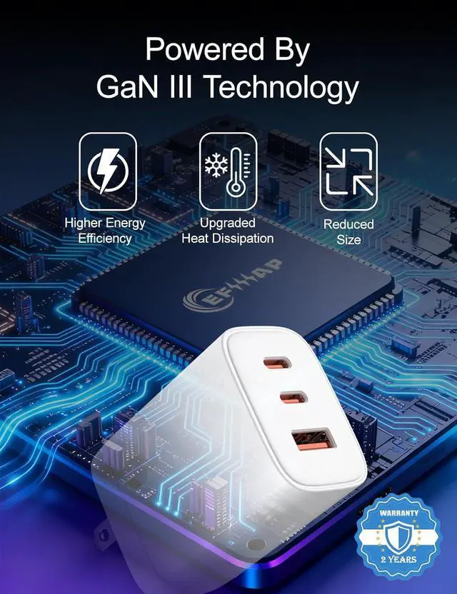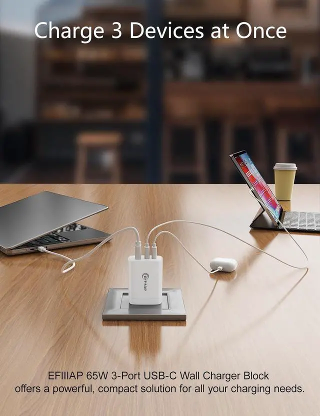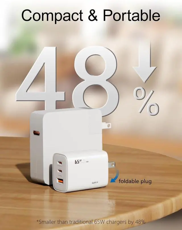 GaN III Chip & 65W High-Speed ChargingEquipped with advanced GaN 3 technology our charger delivers faster more efficient power with less heatfully compatible with MacBook Pro/Air iPhone 17/16/15/14 iPad and more. 3-Ports Multi-Device SupportCharge up to three devices simultaneously with two USB-C and one USB-A ports. Power your phone tablet earbuds and gaming device at once. Compact & PortableSmaller than traditional chargers by 48% with a foldable plug design this charging block is perfect for travel work or home use without bulk. Wide CompatibilityWorks with 98% of electronicssupports PD 3.0 /QC/PPS and other fast-charge protocols for phones tablets laptops and accessories.