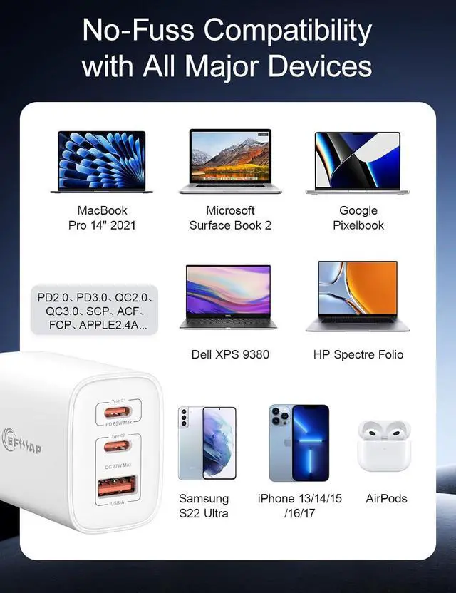 What You GetIncludes EFIIIAP 65W Charger 2PCS (GaN III Series) welcome guide 24-month warranty and friendly customer support. Upgrade your charging experience today!