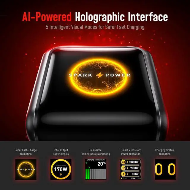 First-of-Its-Kind AI Holographic Display5 Dynamic Interaction Modes: Experience the next evolution of in-car charging. The industrys first AI holographic display brings charging to life with five dynamic animation modes including startup animation real-time power visualization per-port status display temperature monitoring and PD 3.1 28V/5A supercharge handshake animation. Clear vibrant TFT visuals keep you informed at a glance140W PD 3.1 Full-Speed ChargingNo