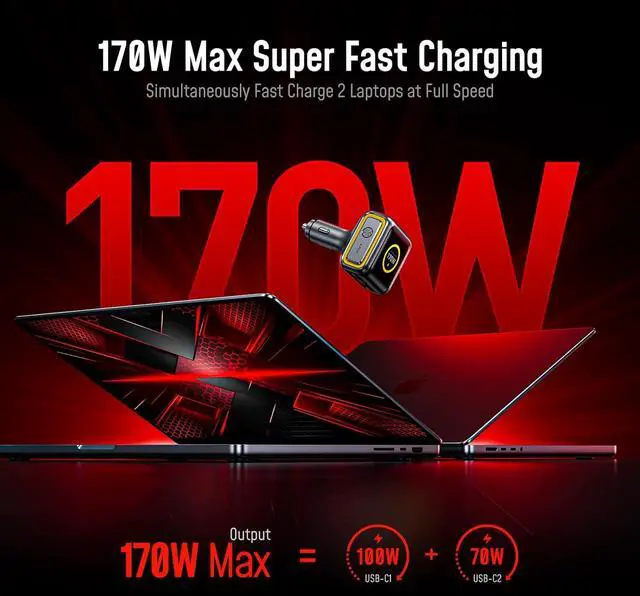 Devices: Designed for universal use this 170W car charger works perfectly with 12V24V vehicles from compact sedans to SUVs pickups vans and RVs. Featuring dual USB-C ports with versatile PD and PPS outputs it effortlessly powers a wide range of devices including iPhones Galaxy Note/Z/S/A series Pixel and other smartphones. It also provides high-efficiency charging for laptops such as MacBook Pro/Air HP ThinkPad and Microsoft Surface. One compact car charger covers all your in-car power needs