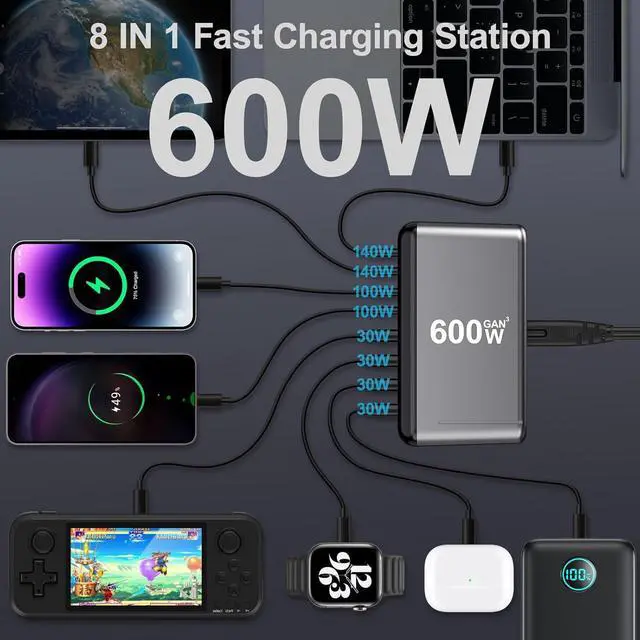 Fast Charger: The USB-C fast charging plug supports power delivery and quick charge functions and has a maximum output of up to 600W. The USB-A interface offers an output power of 30W while the USB-C interface offers charging speeds of 140W and 100W. 8 Port Multi Charger The USB-C charger has 2 USB C ports 140W 2 100W USB-C ports 1 30W USB-C port and 3 USB A ports of 30W which can charge up to 8 devices simultaneously. If you need to charge multiple devices quickly use a combination of USB and USB-C to enjoy simultaneous charging without affecting the charging speed. Perfect Compatibility Thanks to the unique interface the USB socket multi charger is compatible with almost all electronic devices. Whether Android iOS laptops cameras or other USB-enabled gadgets this charger can do it all. Safe and Reliable The power strip with USB is equipped with multiple protection functions to ensure fast and safe charging. The improved smart chip protects your device from over-current over-voltage and short circuit and automatically stops charging when the battery is fully charged. Portable & Compact This USB C charging station is very small and lightweight integrates the C interface and USB interface perfectly making it ideal for home office and travel.