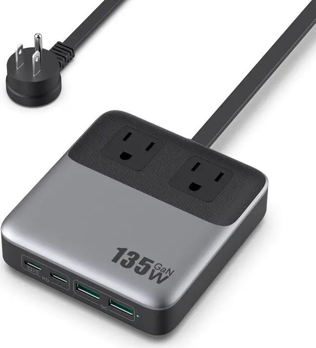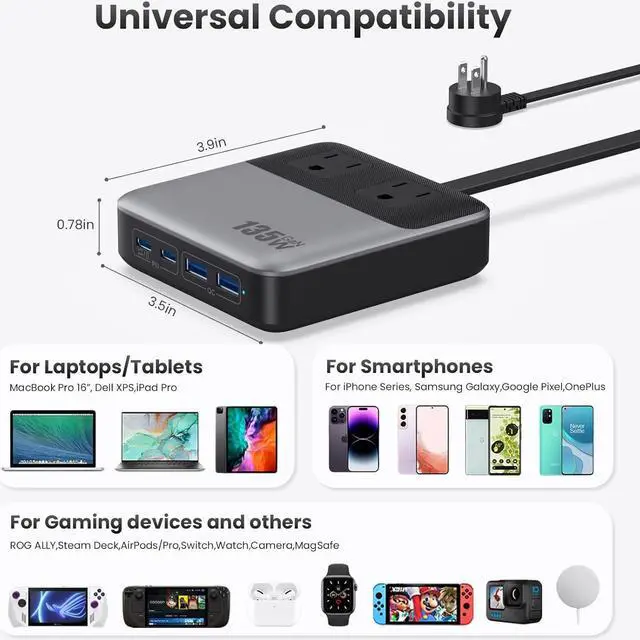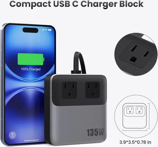 6-in-1 USB C Charging Station for Multiple DevicesPower up multiple devices simultaneously with 6 ports 2 USB-C ports 2 USB-A ports and 2 AC outlets delivering high-speed charging for Macbook Pro 13 (with usb c1 port of 65w) iPhone 16 Galaxy S23. Universal Compatibility for any smartphones tablets laptops and more. Latest GaN IV Charging TechnologyThe Latest Design USB Charger with 135W Total Power and Multiports adapted GaN IV generation chip technology higher energy efficiency higher resistance to radiation and upgraded heat dissipation Gallium Nitride (GaN) makes our chargers smaller and safer without sacrificing a drop of power.