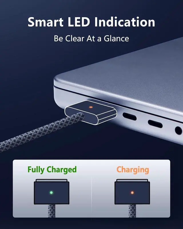 140W Fast ChargingSupports up to 140W Power Delivery (PD) for ultra-fast and efficient charging. Perfect for high-performance laptops that need quick recharging such as for MacBook Pro and MacBook AirMagnetic Connection Like the OriginalStrong magnetic connector snaps into place for secure charging. Detaches easily to prevent accidental drops a comparable replacement fast charging cable for MagSafe 3 chargerCompatible with Latest MacBooksDesigned specifically for MacBook Pro (14-inch & 16-inch 20212024) and MacBook Air (M2/M3/M4 20222025) models with MagSafe 3 port. Works seamlessly with USB-C power adaptersDurable & Tangle-Free Braided CableBuilt with premium nylon braided exterior and reinforced connectors for long-lasting durability.