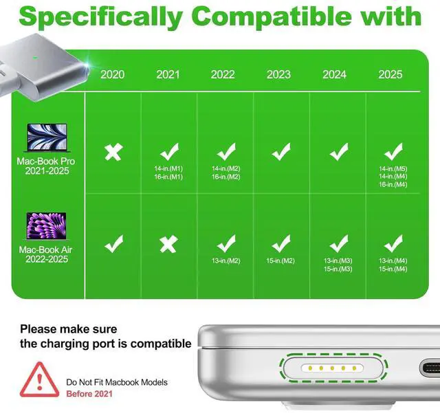 Compatible with MacbookThis USB C to Magnetic 3 Cable only Compatible with MacBook Air (13-inch M4 2025) MacBook Air (15-inch M4 2025) MacBook Pro (14-inch M5 2025) MacBook Pro (14-inch M4 2025) MacBook Pro (16-inch M4 2025) MacBook Air (13-inch M3 2024) MacBook Air (15-inch M3 2024) MacBook Pro (14-inch M2 2023) MacBook Pro (16-inch M2 2023) MacBook Air (15-inch M2 2023) MacBook Air (13-inch M2 2022) MacBook Pro (14-inch 2021) MacBook Pro (16-inch 2021) Please check your computer model to make sure it matches the charging cable.