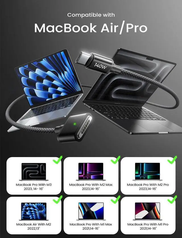 COMPATIBLE WITH MACBOOK: This USB-C to Magnetic 3 Cable only Compatible with MacBook Air (15''/13'' M3 2024 15 M2 2023 13 M2 2022) MacBook Pro (16/14 2023/2021) Please check your Macbook Model and choose the right one140W