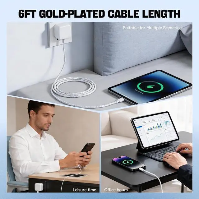 This 40w charger features a built-in thermal sensing function for protection. Certified globally passed CE UKCA FCC and RoHS certifications complying with strict safety and environmental standards[6FT High-Quality Braided Cable] The USB-C to USB-C braided cable features a nylon outer layer being stretch-resistant tangle-free wear-resistant and hard to break. Its 6FT length meets various long-distance charging needs. It perfectly matches dynamic power adapters making it ideal for travel office or home use balancing practicality and durability[What You Will Get] 1 * 40W Dynamic Power Adapter (40W Dynamic Power Adapter with 60W Max) and 1 * 6FT High-Quality USB-C to USB-C Braided Cable.