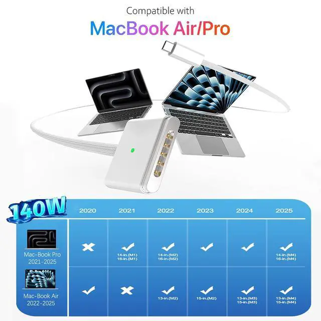 Universal Macbook Compatibility: This Magnetic Safe 3 to USB-C cable is designed for a wide range of MacBook models. Compatible with MacBook Pro (16/14 2024/2023/2021) Air (15/13 M4 2025 M3 2024 M2 2023 M2 2022)) Before purchasing check your model to ensure this charging cable compatible with MacBook charger meets your needs.