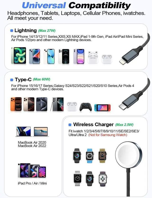 Every Device: Delivers optimized power to each device. Charge your iPhone 17/16/15 Pro at up to 40W iPhone 1411 at up to 27W Galaxy at up to 60W and iWatch at up to 2.5W. Also compatible with other modern Lightning or Type-C devices (Max 27W + 60W). A fast charging adapter is recommended for best results.
