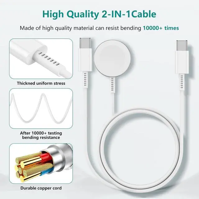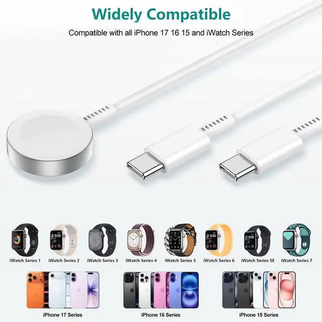 2-in-1 Magnetic Charging Station for iPhone Watch & AirPodsThis all-in-one USB-C charging cable combines a USB-C port and built-in Watch magnetic charger allowing you to simultaneously charge your iPhone and Watch or AirPods (or iPad) with a single cable. Fully charges your iPhone or Watch in just 2.5 hours. Wide CompatibilityOne Cable for All Your Devices. This 2-in-1 Magnetic Charging Cable is designed to work seamlessly with almost all devices including: Watch Watch Series 10/9/8/7/SE/6/5/4/3/2/1 & Ultra. iPhone iPhone 17 Air/17 Pro/17 Plus/17 Pro Max/iPhone 16/16 Pro/16 Plus/16 Pro Max iPhone 15/15 Pro/15 Plus/15 Pro Max (USB-C). AirPods AirPods 3/2/1. No More Adapter Hassles! This 2-in-1 cable keeps all your devices powered up. Simplify Charging & Simplified Life2-in-1 charging station can charge for Watch iphone with just one cable no other cables needed simplifying your living space. Simple integrated design precise slot position no longer have to worry about the wireless charging position being misplaced and unable to charge. Say goodbye to tangled cords and bring you an effortless charging experience. A best cellphone accessory for your desktop and bedside. Simplify chargingno more messy cables! Tangle-Free & PortableCompact Design for Home Office or Travel. Say goodbye to cluttered cables! This 2-in-1 charger features a tangle-free that easily fits in your bag desk drawer or suitcase. No more wrestling with multiple wires; Lightweight and durable perfect for business trips vacations or daily commutes. Stable base prevents slipping whether placed on your nightstand office desk or coffee table. Carry one cable charge all your devicesanywhere anytime! What You Will GetThe package includes 1* 6 feet 2 in 1 iWatch Charger and USB C Cable.