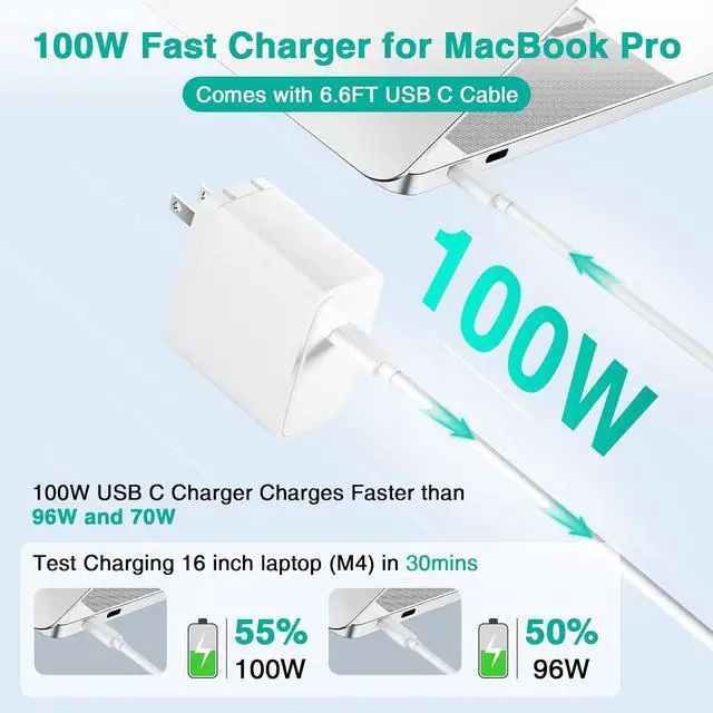 MacBook Pro 16: Our 100W charger is designed specifically for the MacBook Pro 16 inch delivering optimal charging efficiency ensuring full-speed power without overloading. Charges the Pro 16 (M4 2024) up to 55% in just 30 minutes. Outperforms 96W and 70W chargers in stability and efficiency while remaining fully compatible with MacBook Pro 14 inch MacBook Air 15 13 inchIntelligent Charging for Maximum