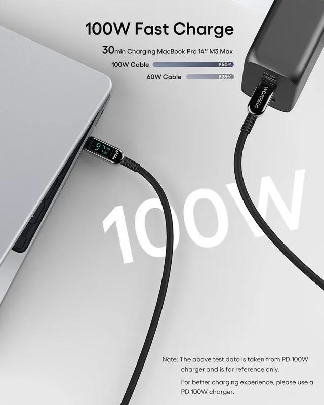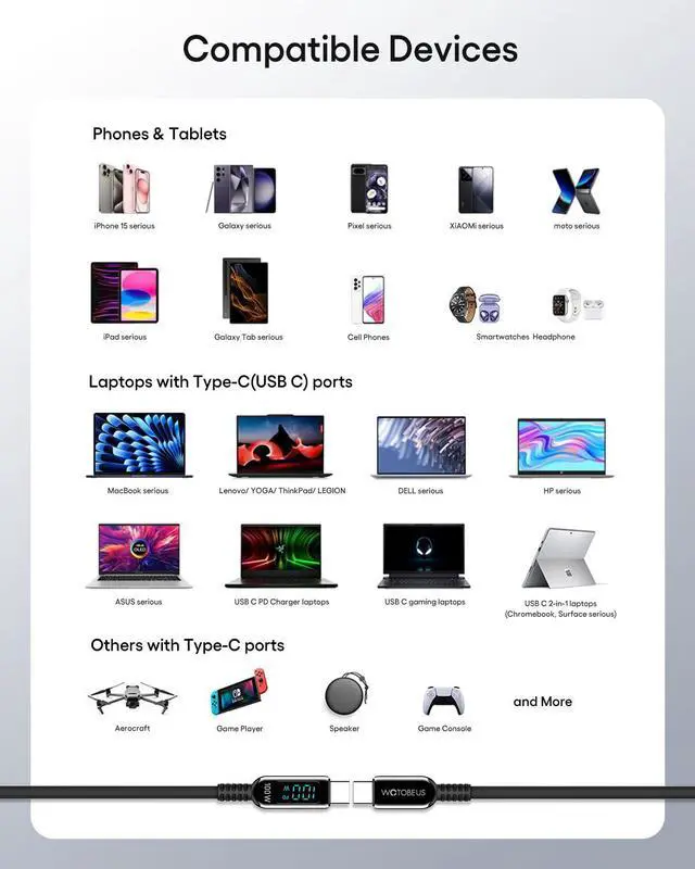 REAL-TIME READOUT: WOTOBEUS 6.5 ft silicone USB-C to USB-C fast charging cable with LED power display shows charging wattage instantly on a bright digital screen. The real-time readout adds a sense of freshness and modern technology making charging feel more intuitive. 2m / 6.5FT