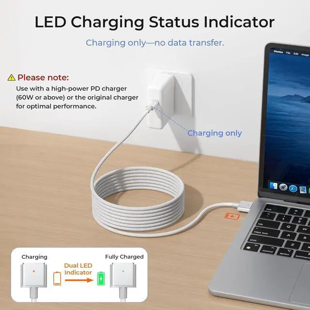 Max Charging: Keep your MacBook powered up in no time with this USB C to magnetic safe 3 cable supporting up to 140W of fast stable charging. For the best performance use it with a PD 3.0 or 3.1 high-wattage USB C charger. Perfect for busy days when you need a quick power boost! Effortless