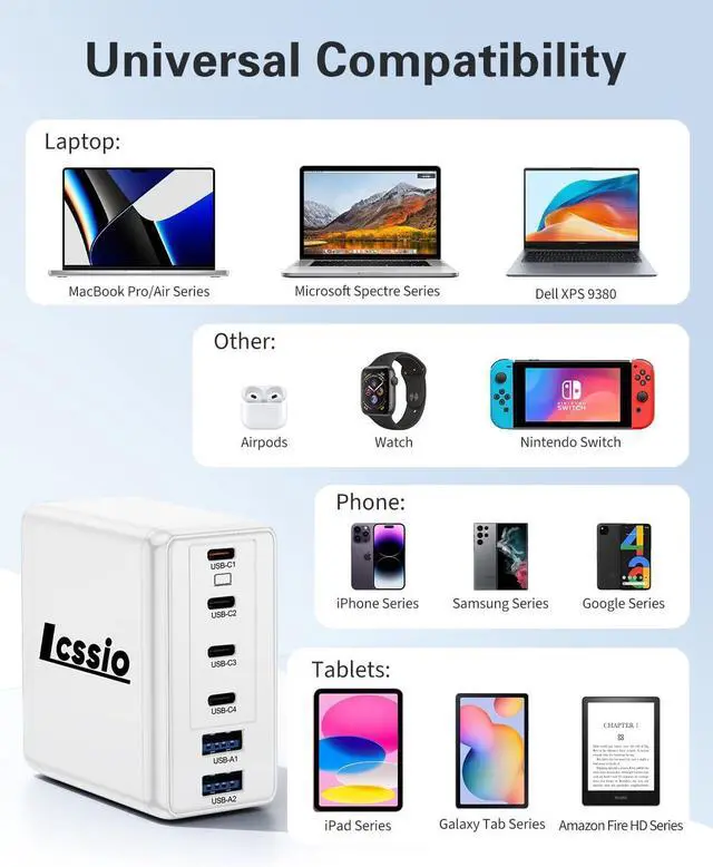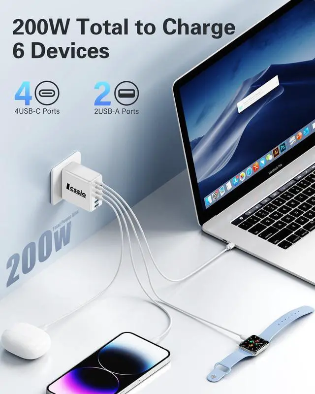 What You Get: 2X Lcssio Charger (200W 6-Port PD 3.1 ) 4X USB-C to C Fast Charging cable user manual 24-month warranty and our friendly customer service.