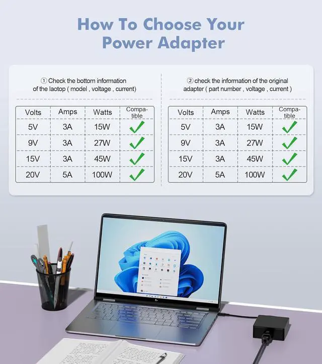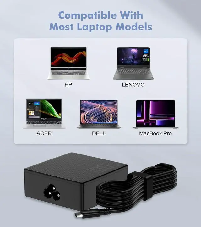 High-speed Charging - Our 100W pd charger delivers fast and efficient charging for your laptop. It is compatible with popular brands like ThinkPad HP Chromebooks MacBooks and more. Multiple Power Outputs - This 100 w usb c charger offers a range of output voltage current and power options. It can deliver 15W 27W 45W 65W or 100W depending on your device's requirements. Please compare it with your original laptop or tablet charger. Wide Compatibility - Designed for laptops using USB-C this 100 watt usb c charger is compatible with various models including ROG-flow X13 Z13 Zenbook 14 Chromebook; Chromebook Chromebook Yoga ThinkPad Series Chromebook Latitude XPS HP X360 Envy Chromebook EliteBook ZBook Spectre MacBook Air MacBook Pro MSI Razer and Google Chromebooks.