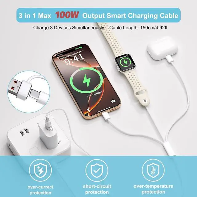Charging Cable: This versatile cable features dual USB-C connectors and an integrated Watch charger offering a complete charging solution for your devices. It is compatible with a wide range of products including MacBook iPhone 17/16/15 (USB-C models) iPad Galaxy Google Pixel HP and laptops as well as most Android phones and Watch Series 1 through 11 SE and Ultra models. 100W PD Fast Charging & High-Speed Data Sync: Experience immense charging power and high-speed data transfer with this advanced cable. It supports 100W Power Delivery (20V/5A) allowing you to rapidly charge a single device such as a laptop or intelligently distribute power when charging multiple devices simultaneously. Featuring a certified built-in E-Marker chip it ensures safe and stable power delivery while supporting data transfer speeds of up to 480Mbpsideal for quickly syncing large files photos and videos across your devices. Perfect for