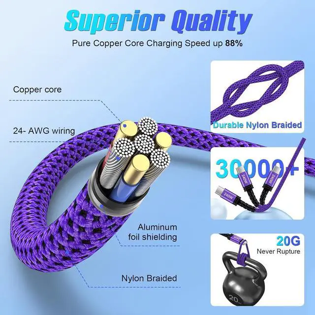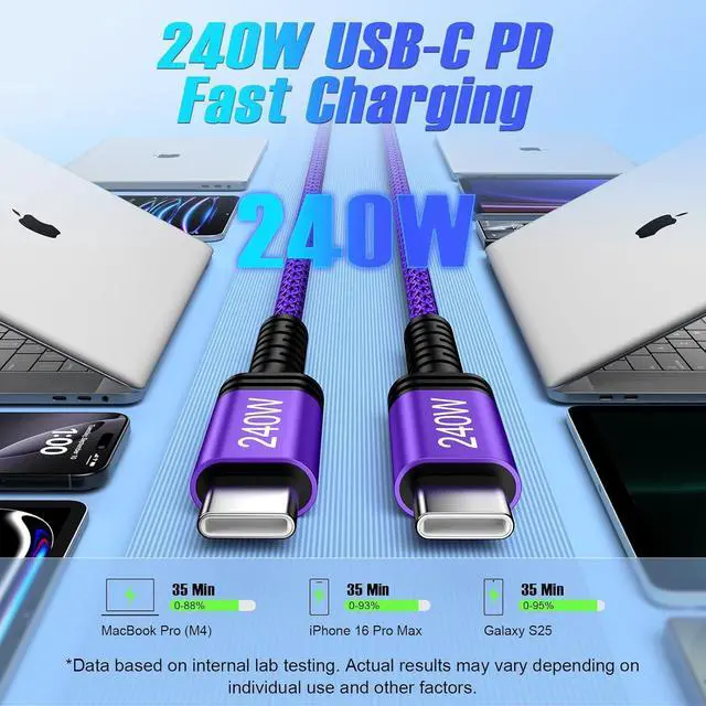 USB C Cable: The 240W USB C to USB C Cable is also compatible with 140W/ 100W/ 65W/ 60W/ 45W/ 20W just make sure the plug using is appropriate this type c charger fast charging 10ft offers the fastest charging speed super fast charging your MacBook Pro 14/16 (M4) to 88% in 35mins. 240w usb c to usb c fast charging cable supports galaxy s25 ultra 45w super fast charge 2.0 (095% in 35 mins) and iphone 16 45w high-speed charging (093% in 35 mins). The type c cable can meet the demands of fast charging in the next 5-10 years. 240W Fast Charging & 480Mbps