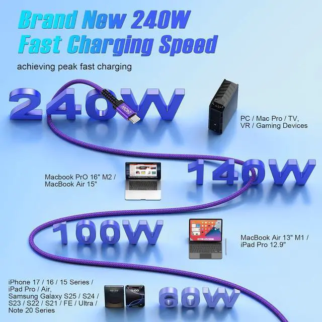 All C-Port Devices: 240W USB C to C cable fast charging cord works flawlessly with all existing C-port devicesLaptops Phones Tablets STEAM DECK and Switch. Such as for iPhone 17 Pro Max/17 Pro/17 Air/17 iPhone16e/16/16 Pro/16 Plus/16 Pro Max/15/15 Pro/15 Plus/15 Pro Max Galaxy S25 S24 S23 S22 S21 S20 Ultra/FE/Plus S10 S9 S8 A17 A36 A16 A26 A56 A35 A55 A15 A54 A14 Z Flip 7/7FE Z Fold 7/SE; Google Pixel 10/10 Pro/10 Pro XL/10 Pro Fold/9/8/7 M1 M2 M3 M4 MacBook Air 2025 2024 2023 2022 2021 2020 MacBook Pro 13 14 15 16 inch iPad Air 13 2024 2025 iPad Pro 13 11 2024 iPad Air 11 2025 iPad Pro 12.9 inch; Moto LG Oneplus HTC Sony Kindle fire PS5 and more USB C port devices. Enhanced Safety with