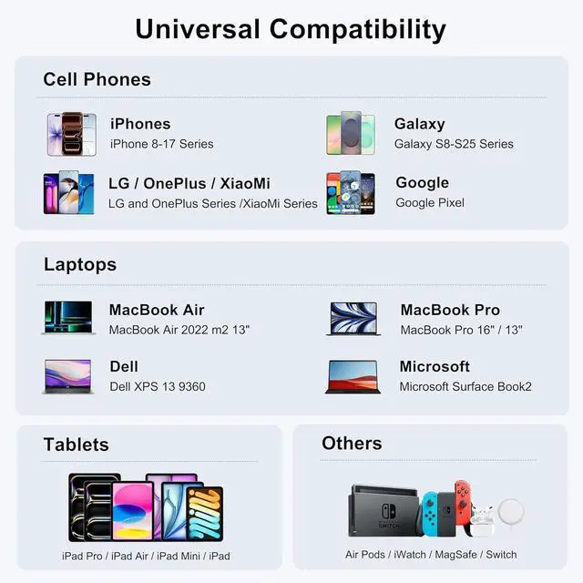 USB C Fast Charger Block compatible with MacBook Pro MacBook Air MacBook iPhone 17/17 Plus/17 Pro/17 Pro Max iPhone 16/16 Plus/16 Pro/16 Pro Max iPhone 15/15 Plus/15 Pro/15 Pro Max iPhone 14/14 PRO/14 PRO MAX/13/ 13 Mini/ 13 Pro/ 13 Pro Max iPhone 12/ 12 Mini/ 12 Pro/ 12 Pro Max/ XS/ XS Max/ XR/ X/ 11/ 11 Pro/ 11 Pro Max/ Galaxy S23 Ultra/ S22/ S21+/ S21/ S21 Ultra/ S21 FE/ S20+/ S20/ XPS 15/ 13 Google Pixel iPad Pro iPad Mini Series/ iPad Air Series? Fast Charging GaN Charger150W GaN PD Charger utilizes GaN Chip to increase the charging efficiency and performance up to 90%.