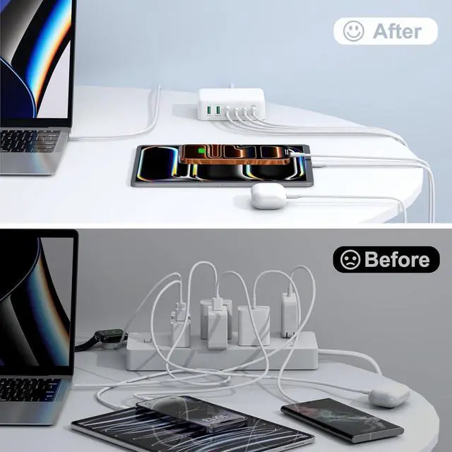 ? The Only Charger You NeedThis is a trendy multi-port USB C charger that can simultaneously charge 6 devices. USB C1 can output up to 65W and it only takes 2.5 hours to fully charge for MacBook Pro 16. USB C2 can output up to 20W Super fast charging for your phone. USB C3 (Max 20W PD 3.0 ) and 3 x USB A (Max 18W QC 3.0 ) ensure the best charging effect for mobile phones watches earphones? Universal CompatibilitySay goodbye to your old chargers this USB C charging station meets your daily charging needs.