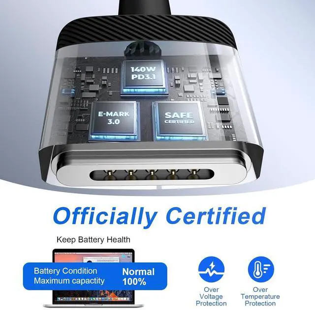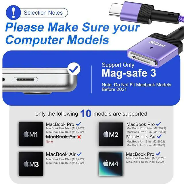 NOTE: 1. Features USB-C plug (NOT USB-A). Please verify your MacBook model compatibility before purchasing. 2. magnetic 3 cable is NOT suitable for MacBook models before 2021. 3. NOT support for data transfer just for charging. Strong Magnetic ConnectionWith powerful magnetic grip m4 macbook air charger provides a consistent charging experience that macbook pro charger prevents disruptions. magnetic charging cable plug of macbook m4 is firmly guided to fit macbook air m4 15 inch 2025 charging port by a powerful magnet design on one end. Releases safely in case of a trip to secure macbook air 15 m4. usb-c to magsafe 3 cable ensures quick charging by resisting the magnetic charger majority of accidental disconnections. Safety & DurabilityLongevity of mac charger is enhanced by strengthened robust Nylon Braided cover to stand 80 000+ bend test. macbook pro magsafe cable is resistant to tangling bending and wear. strengthened at the port using metal that macbook air m4 charger usb c has been laser-welded and remains in place. to ensure long-term resilience mac book pro m4 magsafe 3 cord ports pass a 13kg loading test and to protect the solder junction the copper core is UV-glued.