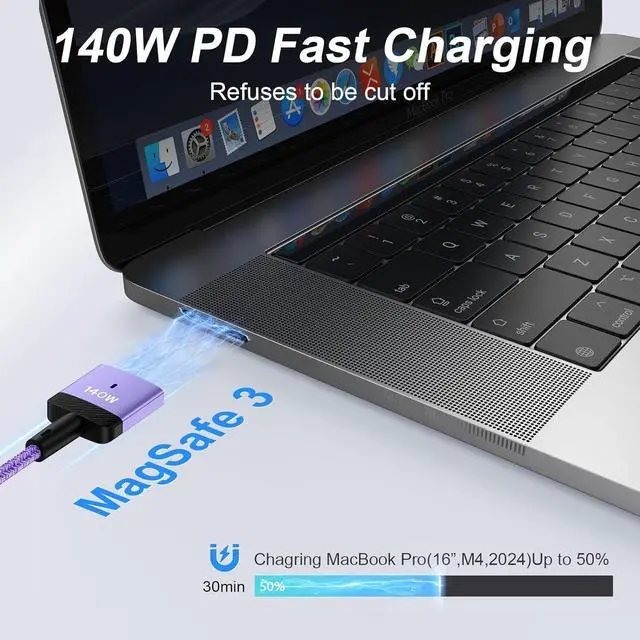 140W Fast Chargingmacbook air m4 charger cable supports PD 3.1 and has a max power of 140W depending on macbook air 2025 and charger adapter. In just 30 minutes macbook pro m4 may be quickly charged from 5% to 60%. Using a primary 140W or secondary 96W power adapter is highly recommended for rapid charging.