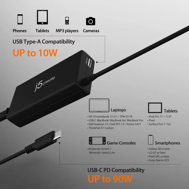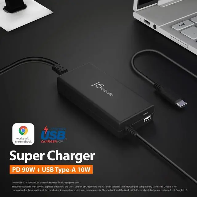 Perfect for Chromebook and MacBook This 100W Super Charger has been tested and certified by Google engineers to work with current and future Chromebook devices. The USB-C cable can provide up to 90W of power and the USB Type-A port can supply up to 10W of power allowing you to fast charge two devices at once. The power adapter supports surge overcharging overcurrent and overheating protection to prevent damage to connected devices and ensures safe charging. Fast Charge Two Devices Simultaneously. The USB-C cable automatically supplies up to 90W charging power and up to 10W for the USB Type-A port when charging 2 devices at once Multi Protection to safeguard you and your devices USB-C PD Compatibility USB Type-A Compatibility Phones Tablets.