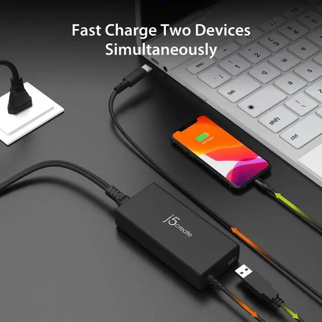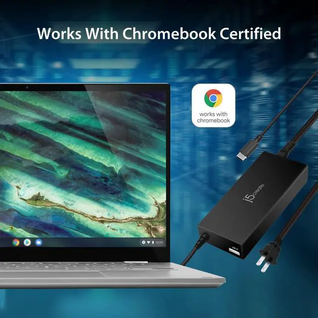 USB-C PD Compatibility with Chromebook. Additional USB port allows you to charge your mobile device without powering up your laptop. Works with Chromebook certified. Certified by Google engineers to work seamlessly with current and future Chromebook devices. Safe Charging. The power adapter supports surge overcharging overcurrent and overheating protection to prevent damage to connected devices and ensures safe charging.