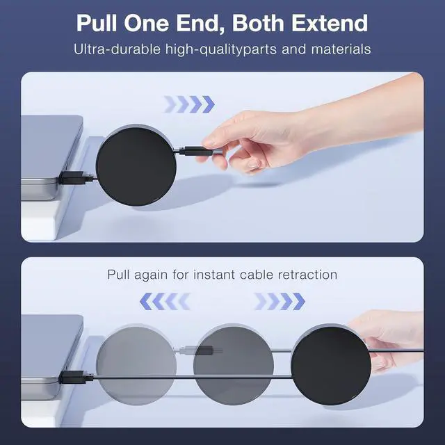 Pull-to-Use & Retract-to-Store: The cable extends smoothly to its full 5.4 ft length with a gentle pull from either side. When done just give it a slight pull and releaseit automatically retracts completely keeping your desk tidy and bag organized.