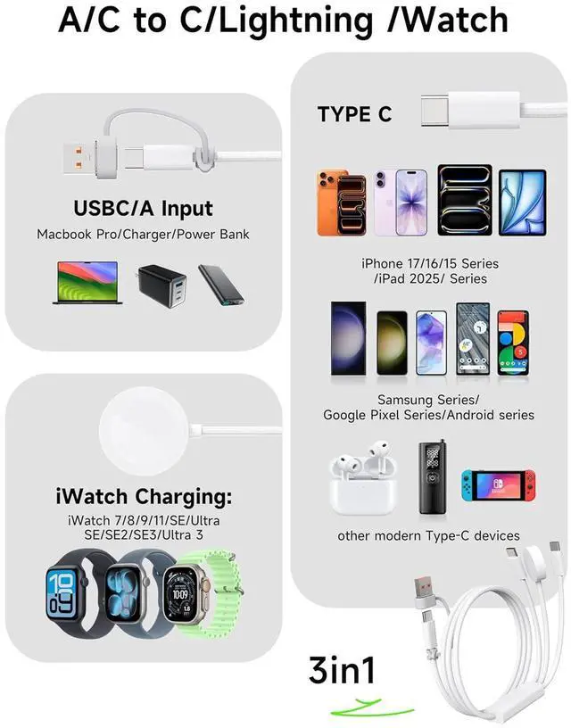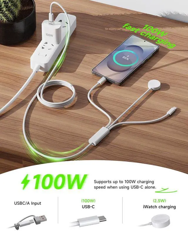 Upgraded 3-in-1 Multi Charging Cable Design The latest ZEEHOO 3-in-1 USB C charging cable features an upgraded design with two USB-C ports and one magnetic Watch charger replacing the old Lightning connector. Fast charge three devices simultaneously eliminating cable clutter for iPhone iPad MacBook and Watch ideal for home office or travelStrong Magnetic for Watch Charger Specially designed for Watch Ultra / SE / Series 101 the built-in magnetic wireless charger ensures stable secure and precise alignment for efficient charging every time. Not compatible with or other smartwatch models. 100W PD Fast Charging & High-Speed Data Transfer Supports up to 100W Power Delivery (20V/5A) when using a single port and intelligently shares power when charging three devices simultaneously.