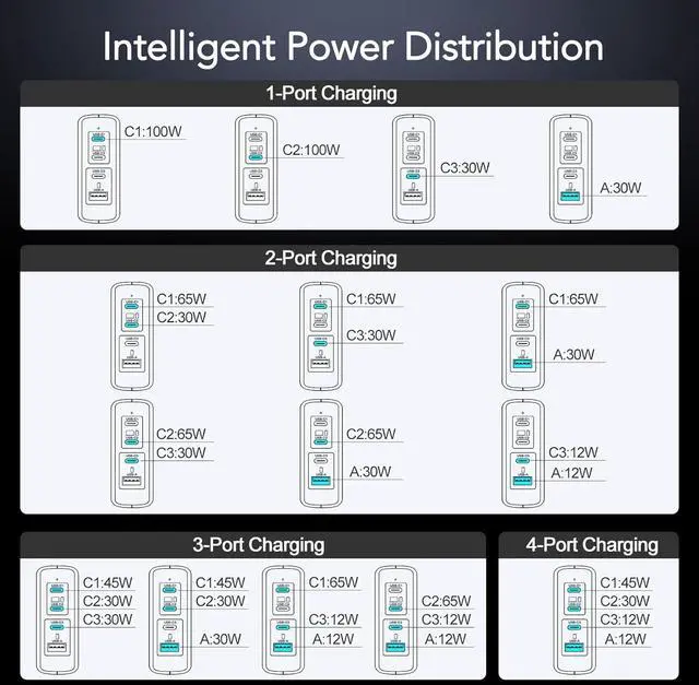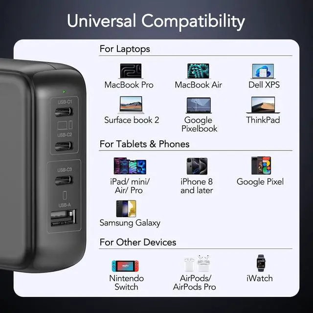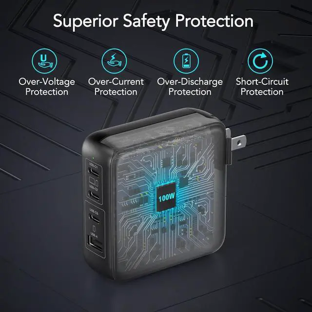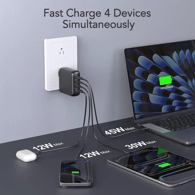 4-in-1 Multi-Port Charger: Simultaneously charge up to 4 devices with 3 USB C ports and 1 USB A port delivering a total of 100W of power to phones tablets laptops and other devices with power intelligently and efficiently distributed between the four ports to ensure optimal charging ideal for office work or on the go.