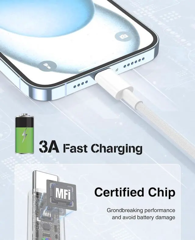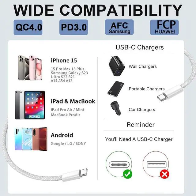 For iPhone 17 iPhone Air iPhone 17 Pro iPhone 17 Pro Max iPhone 16 / 16 Puls / 16 Pro / 16 Pro Max iPhone 15/15 Pro/15 Pro Max/15 Plus New iPad Mini iPad Pro 12.9 in/ 11 in iPad Air iPad 10 Galaxy S23/S23+/S23 Ultra/S22/S22+/S22 Ultra/S21/S20/Note 20 Google Pixel and more phones but also support fast charging of Type-C laptops and tablets. Quality Commitment and GuaranteeYou will get 3pack MFi Certified fast charger cable. Our cable has a 3-year warranty and we promise that as long as there are quality issues with the data cable we will only replace it and not return it.