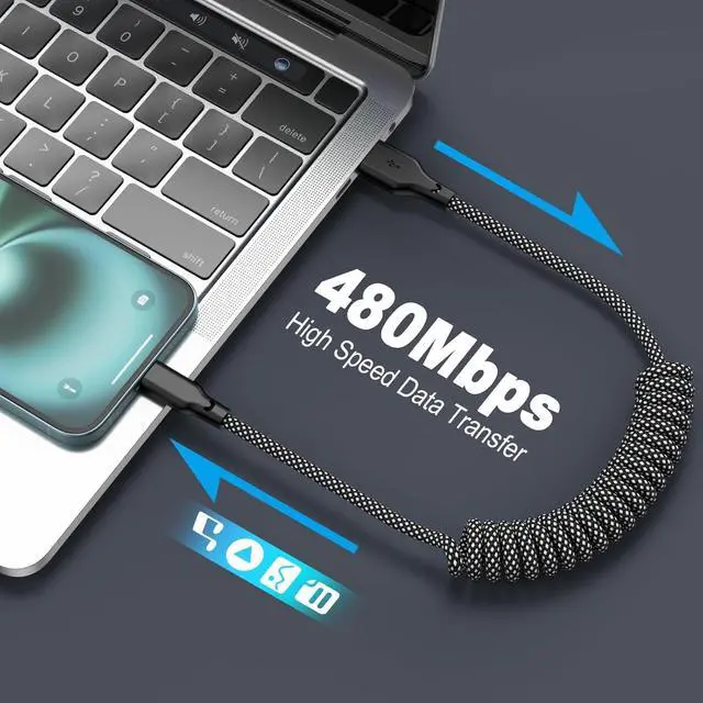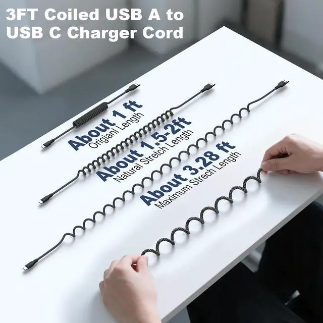 3FT Coiled USB A to USB C Charger Cord Spring-shaped retractable design keeps your car office or travel bag clutter-free. The cord naturally retracts to 1 ft when not in use stretches comfortably to 1.52 ft for daily charging and extends up to 3.28 ft when needed. Fast Charging & High-Speed Data SyncEquipped with 3A quick-charge technology this USB C cable delivers rapid safe charging for your devices. It also supports 480Mbps data transfer making file syncing effortless. Durable Braid Carplay Cable & Tangle-ResistantBuilt with flexible high-quality PU material and reinforced connectors this coiled usb c cable resists knots twists and wear.