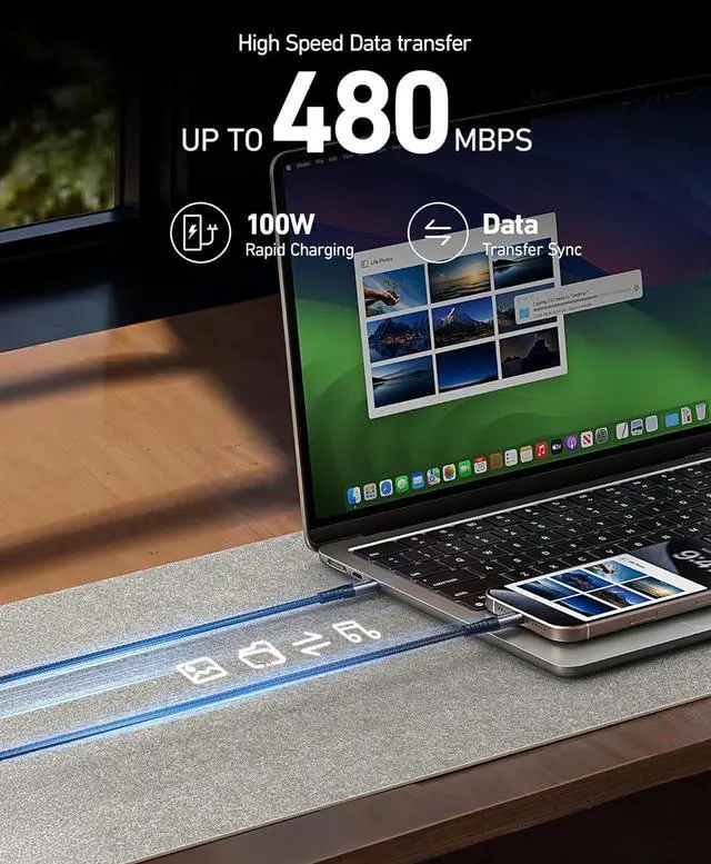 Ultra Fast 100W USBC Fast Charging Cable Experience super fast charging with our long usb c cable supports PD 4.0 / 3.0 and QC 5.0 / 4.0 fast charging up to 20V/5A (max) with USB-C Power Delivery block such as 30W/45W/60W/65W/96W/100W. and data transmission up to 480Mbps efficiently transferring music files pictures and videos in short time. 15FT Extra Long USBC Cable Say goodbye to limited mobility! With an extra-long 15 foot design this long usb-c cable provides unmatched flexibility allowing you to charge your smart phone/iPad/Macbook comfortably from a distance whether at home in the office or on the go.