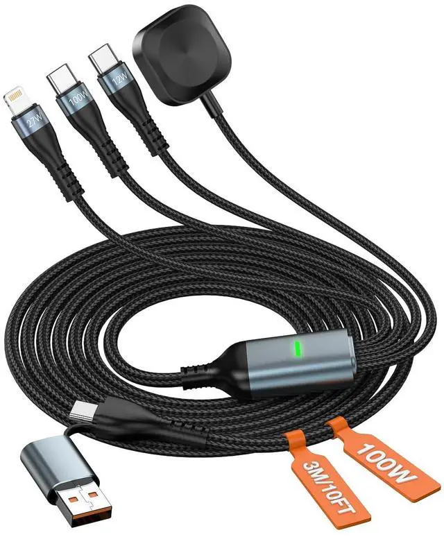 The dual configuration on this multi charger cable allows simultaneous charging of multiple devices. The 100W USB? C also supports 480Mbps data transfer for laptops/phones/iPad and in? car use while the secondary 12W port keeps earbuds or fans powered. A truly intelligent cable system for the connected lifestyle.?? Extended 10? Foot Cable Durable Comfortable Travel? ReadyEnjoy freedom of movement with this multi charging cable 10ft engineered for flexibility and strength. Its nylon braided exterior and reinforced joints withstand over 20 000 bends. Extra? long reach keeps devices accessible in bed on the sofa or in the car a premium long? lasting solution that handles real? world use not just desk setups.